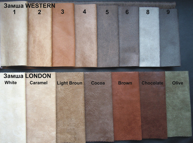 Оббивні матеріали: екошкіра Флай, Титан, Мадрас а також шкіра Люкс. Наприклад, для поціновувачів матового покриття підійде Флай, глянець ж присутній у Титані та Мадрасі. Шкіра Люкс має і матове і глянсове покриття.